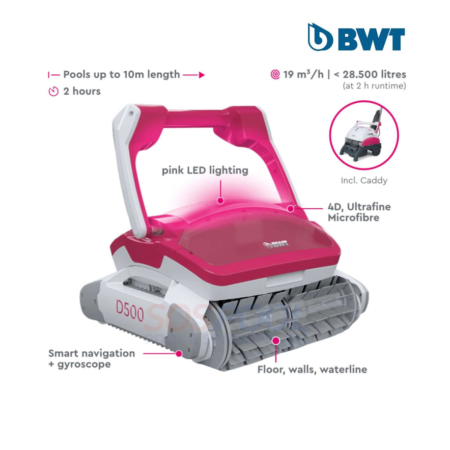 But the D500 doesnÕt just cleanÑit illuminates. Featuring a stunning pink LED light, this robotic cleaner adds a touch of ambiance to your pool while it works, making night-time cleaning an unexpected visual treat.