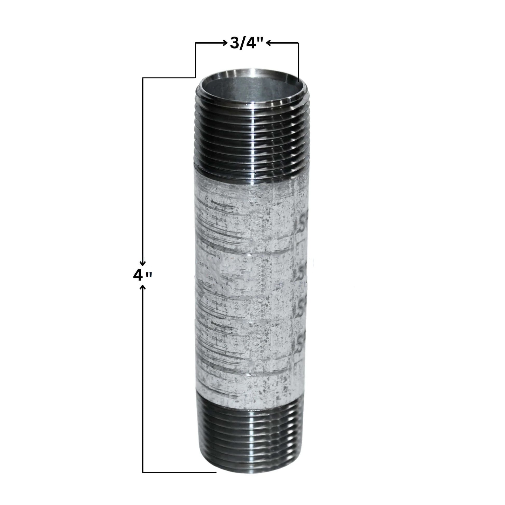 The Galvanized Steel Nipple, is designed for extending pipe connections in plumbing, gas, and other piping systems. Constructed from durable galvanized steel, it offers excellent resistance to corrosion, ensuring longevity and reliability. Sized at sized 3/4" x 4" its threaded design ensures a secure and leak-resistant connection, making it suitable for residential, commercial, and industrial applications. This fitting is ideal for joining pipes or fittings in water, gas, and air systems while maintaining system integrity.