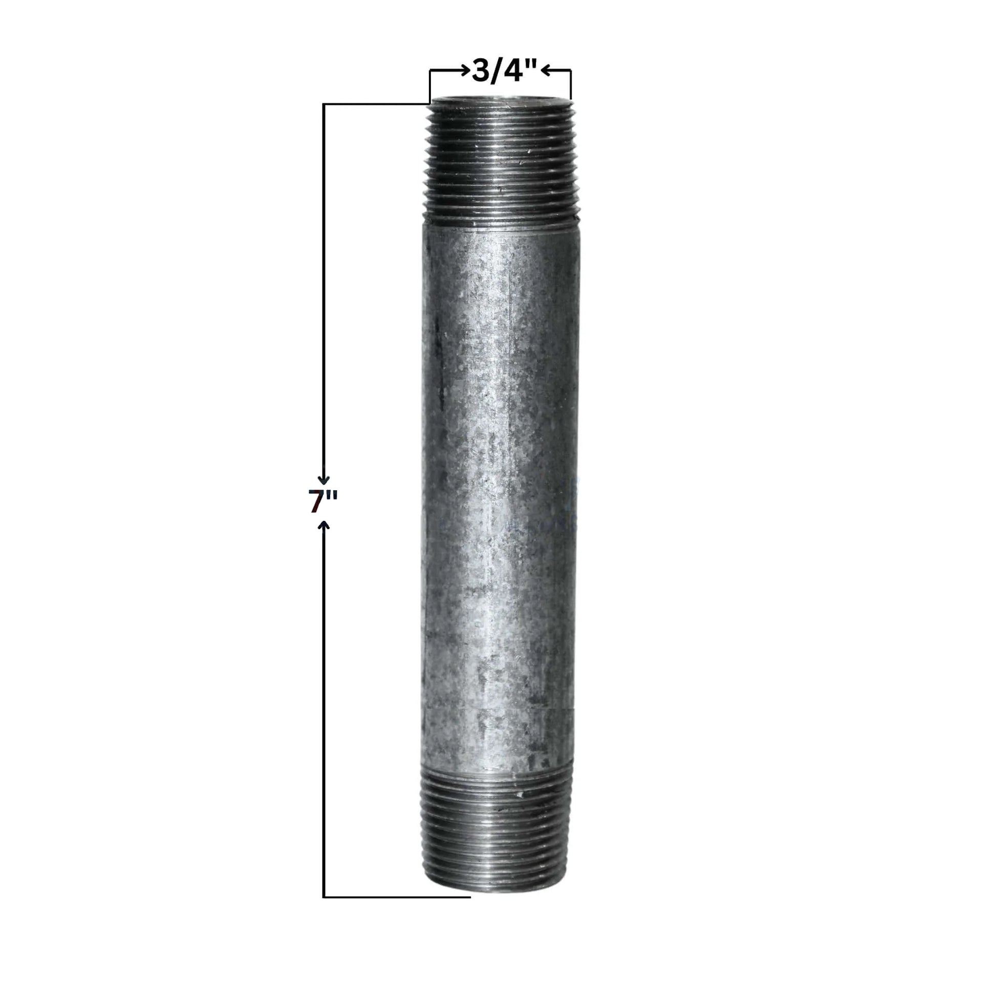 The Galvanized Steel Nipple, is designed for extending pipe connections in plumbing, gas, and other piping systems. Constructed from durable galvanized steel, it offers excellent resistance to corrosion, ensuring longevity and reliability. Sized at sized 3/4" x 7" its threaded design ensures a secure and leak-resistant connection, making it suitable for residential, commercial, and industrial applications. This fitting is ideal for joining pipes or fittings in water, gas, and air systems while maintaining system integrity.