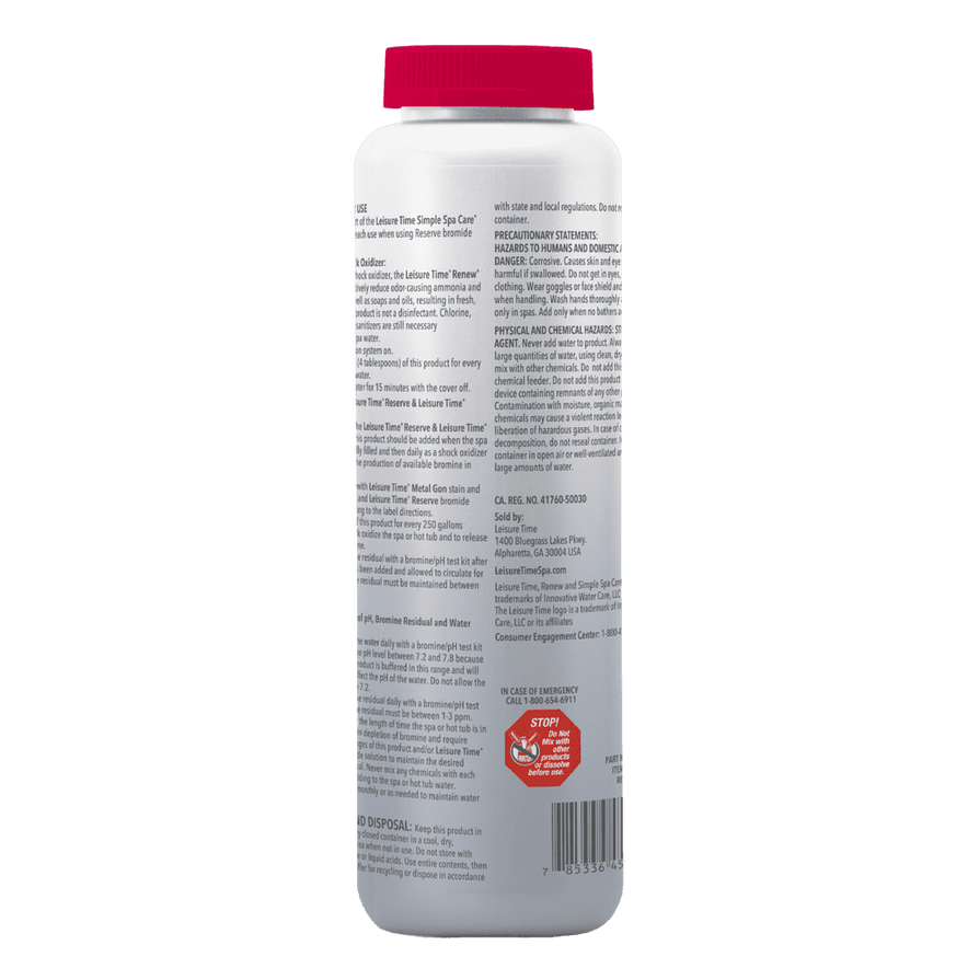 Leisure Time Renew serves as a non-chlorine shock oxidizer designed for spa maintenance. This quickly dissolving granular formula effectively eliminates residual soaps, deodorants, natural oils, and organic materials that may accumulate in spa water. Upon introduction to the spa water, Renew reacts with bromide, creating a bromine solution that eradicates any remaining microorganisms left by bathers. Additionally, this product is pH buffered, ensuring it does not impact the pH levels.