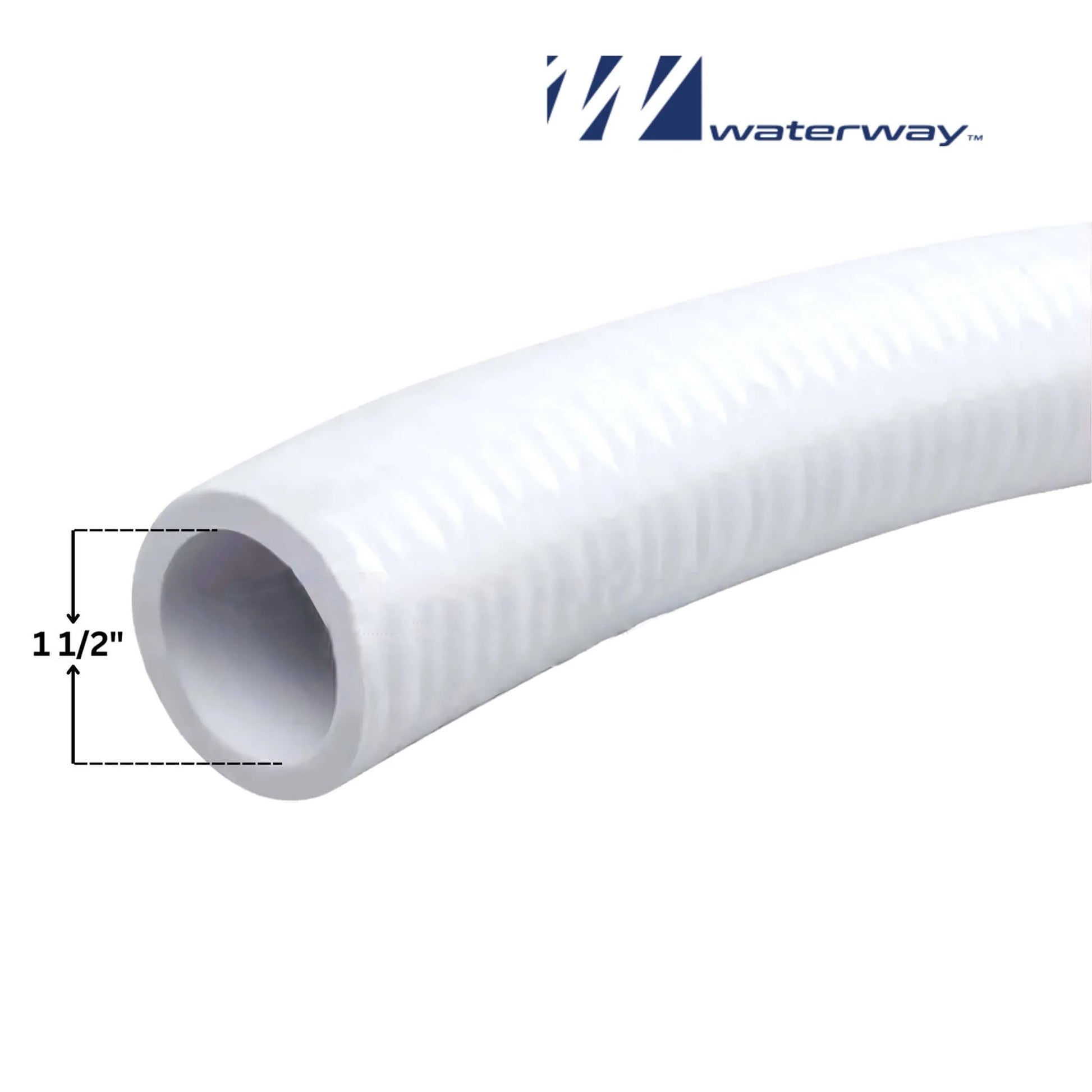 The Waterway Flex Pipe, a 1-1/2-inch diameter flexible white pipe, offers a 5-foot length for versatile pool and spa plumbing applications. Made in the USA its designed for easy maneuverability, this durable and lightweight pipe accommodates complex installations, including tight bends and corners, without the need for additional fittings. Its flexibility minimizes installation time and allows for a seamless connection to standard plumbing components. Constructed from resilient materials, it resists cracking, corrosion, and leaks, ensuring long-lasting performance in a variety of pool and spa systems.